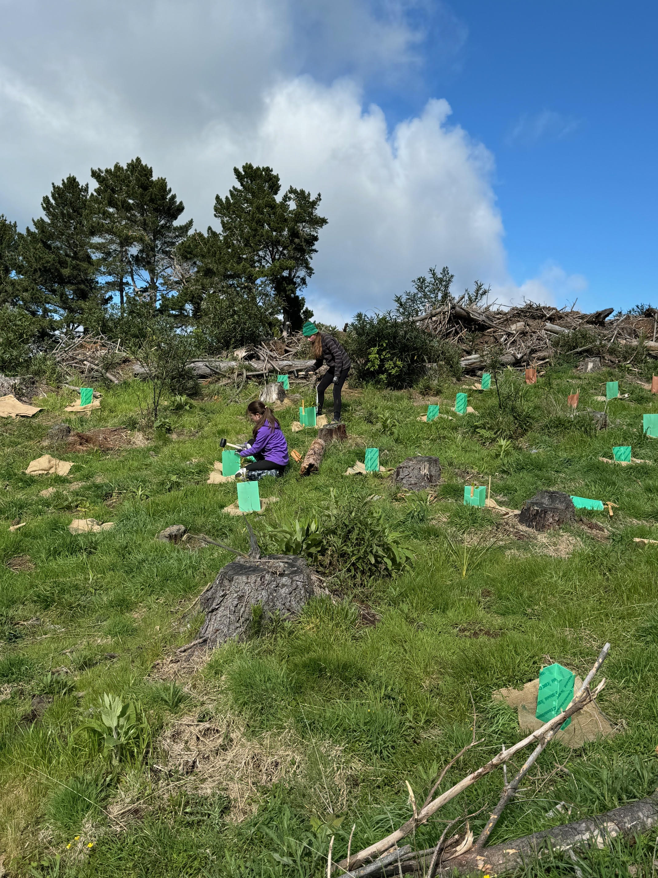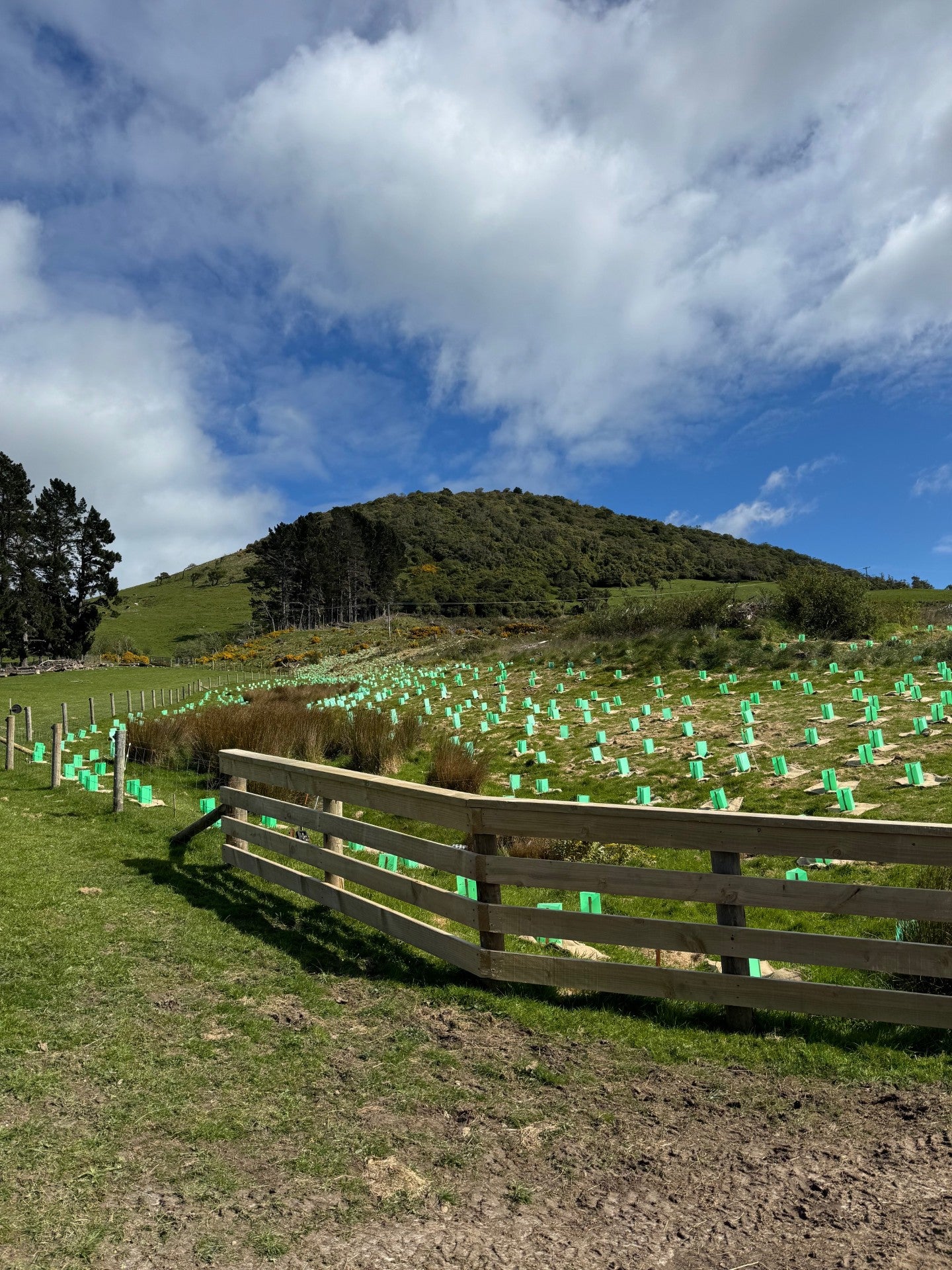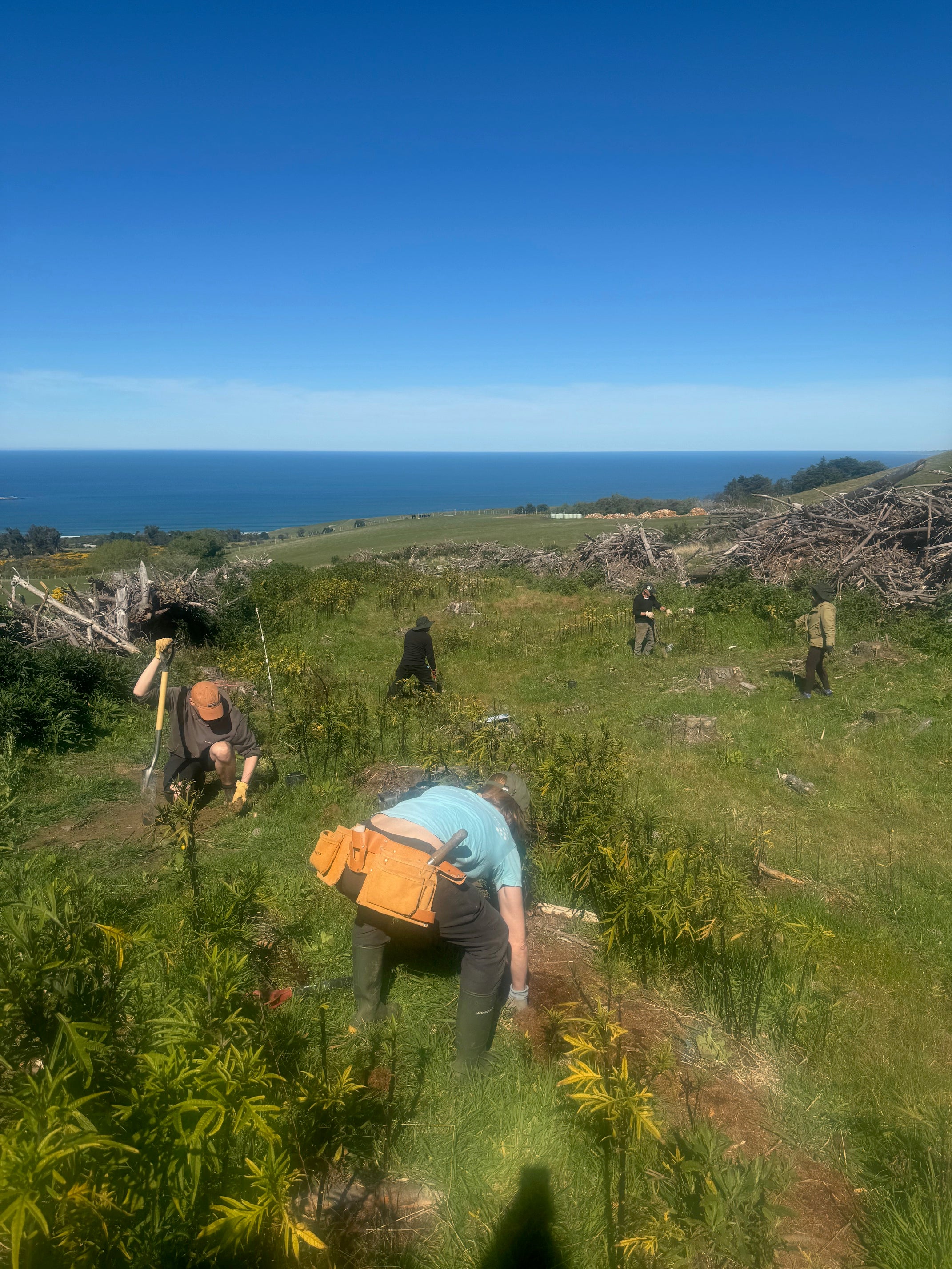 The area of windblown pines had begun to resemble a giant game of pick-up sticks. With each passing storm, more trees toppled, and the damaged zone continued to expand. While the remaining timber was still commercially viable—and the ground finally dried out in late summer 2023—it became clear that the time had come to harvest the old pine plantation. Although the harvest was ultimately a forced decision, it created an unexpected opportunity: the chance to return the land to native bush. All proceeds from the harvest were reinvested directly into the project, helping to cover the costs of windrowing the slash, repairing fencing, developing the restoration plan, and purchasing seedlings for the first phase of planting.